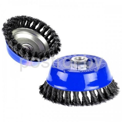 Щетка с чашкой с гайкой М14 из витой проволоки. Нержавеющая сталь. Подходит для трудоемких работ и большой степени зачистки. Предназначена для использования с углошлифовальными станками ("болгаркой").
